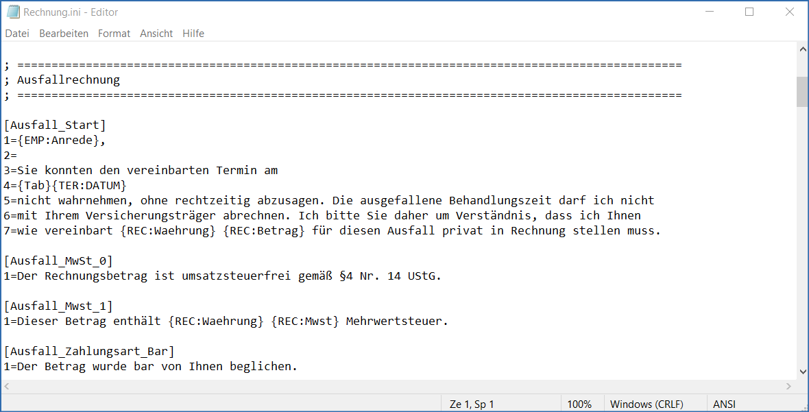 | Gemeinschaftspraxis | Druckt die vorformulierten Rechnungstexte im Plural. |