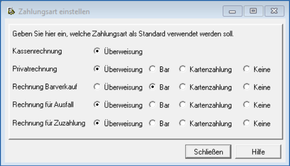 Aktiviere die Optionsfelder der Standardzahlungsart für die aufgeführten Rechnungskategorien.